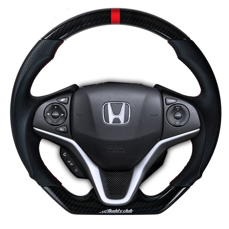 The Buddy Club Carbon Steering wheel for the new 2015+ Honda Fit replaces the factory core with a variant matching the Type R Carbon look. This version allows you to keep all of the factory steering wheel controls and most importantly, the driver airbag.
