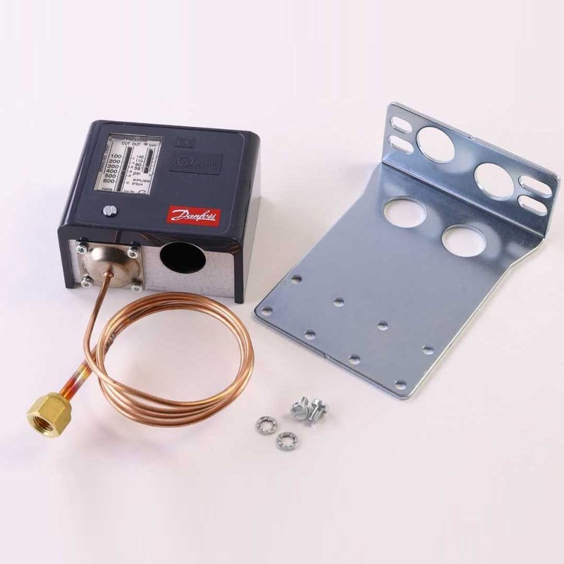 The Danfoss 060-5245 is an SPDT pressure switch designed for precise temperature control in refrigeration systems using R410A refrigerant. This switch operates within a range of one hundred to six hundred PSI, ensuring accurate pressure monitoring and reliable operation.