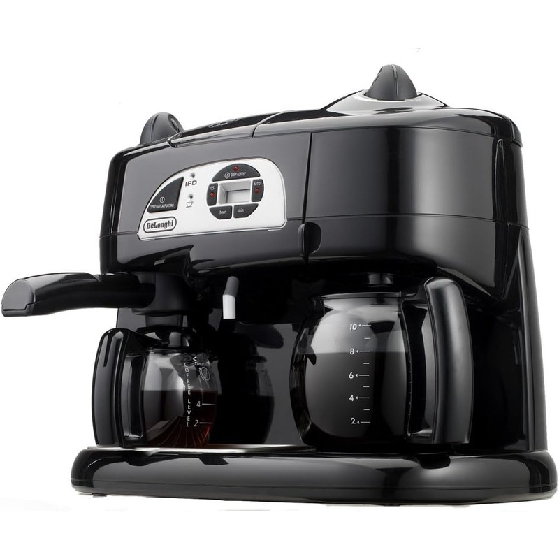 The DeLonghi Combination Espresso/Coffee machine is an all-in-one machine that can brew coffee and espresso simultaneously. This machine can also prepare a great cappuccino, latte or hot chocolate for the perfect drink. The patented instant froth dispenser lets you add froth right in the same cup as your coffee or cappuccino. This machine features programmable digital timer that allows you to set the machine to turn on at a later time and even sets to the exact minute. The Vario system and Accuflavor selector dials allow you to choose the strength of espresso and coffee just the way you like it. The 10 cup Carafe allows you to make enough cups of coffee to keep everyone satisfied and the Drip Interrupt feature lets you have a cup before the pot is done brewing.