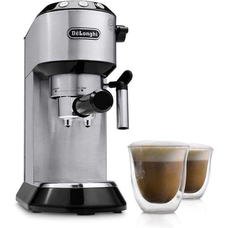 The De'Longhi Dedica Stainless-Steel Slim Espresso and Cappuccino Machine offers a traditional espresso and cappuccino experience in a sleek ultra-compact design crafted with skill and passion. Save on precious counter space while still enjoying perfect espresso and cappuccino with the slim 6" design. As a bonus, the machine includes two De'Longhi double-wall thermal cappuccino glasses.