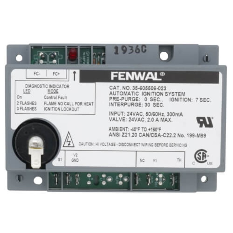 Enhance the reliability and performance of gas-fired appliances with the Fenwal 35-605506-023 Ignition Control. This compact unit is engineered for automatic ignition and flame sensing, geared to support both natural and manufactured gas types.