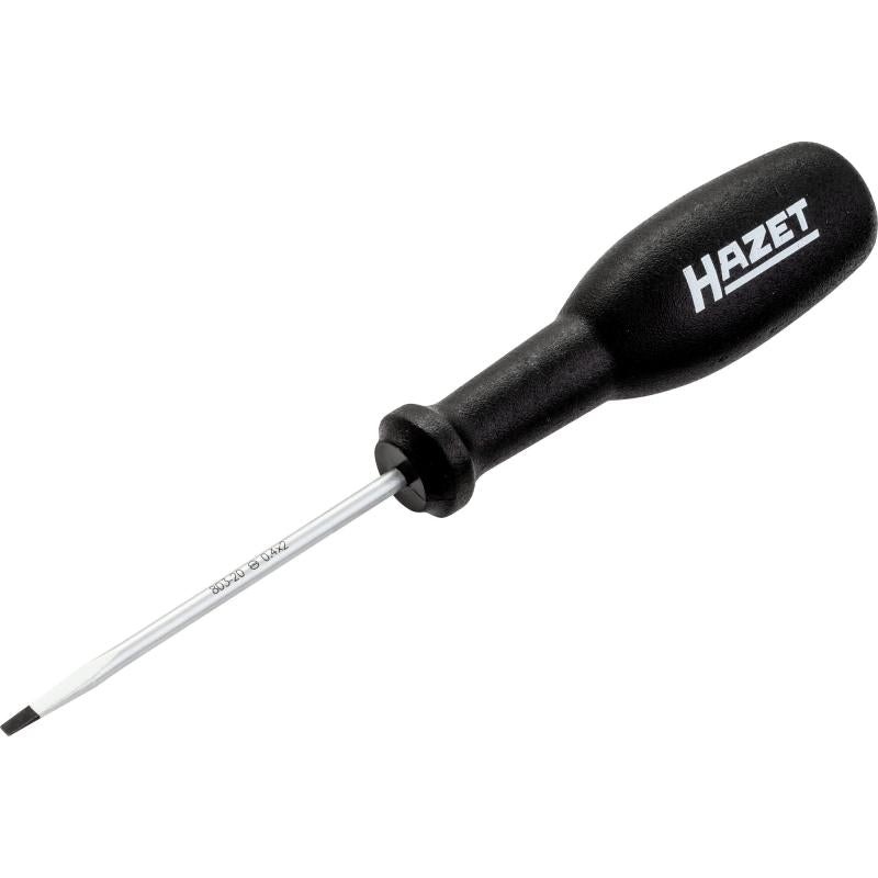 General InformationBrandHazetPart Number803-20Product TypeScrewdriverPackagingBulkUPC4000896077434California ResidentsProposition 65 WarningPhysical CharacteristicsColorBlackFinishChrome-plated, tips burnishedLength143 mmWeight0.02 kg0.04 lbDetailsTip TypeSlot profileSize0.4 x 2 mmBlade Length63 mmFeaturesRound blade