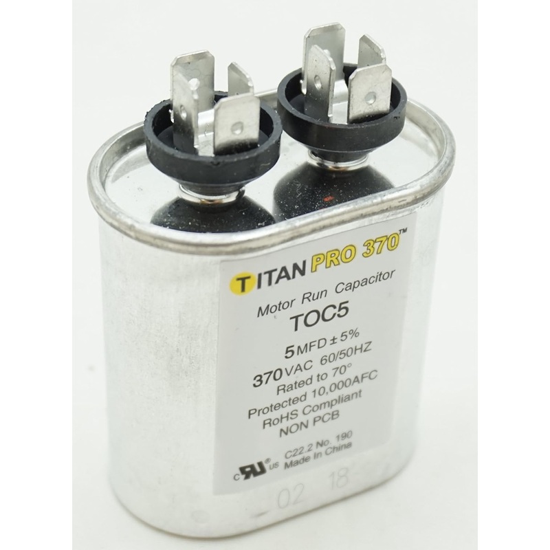 The Packard TOC5 Motor Run Capacitor is designed for reliable and efficient performance in industrial motor applications. This essential component, featuring a capacitance of 5 MFD and a voltage rating of 370V, ensures the smooth operation of motors.