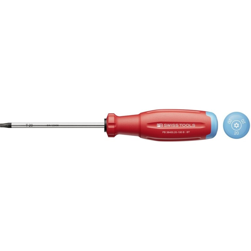 General InformationBrandPB Swiss ToolsUPC7610733296347California ResidentsProposition 65 WarningPart NumberPB 38400.20-100 BProduct TypeStandard ScrewdriversPhysical CharacteristicsLength209 mmWidth31 mmHeight31 mmDiameter 5 mmWeight0.08 kg0.18 lbDetailsTip TypeTorx SizeTorx 20Blade Length100 mmFeaturesSwissGrip Evo screwdriver for Torx screws, with bore at the tip