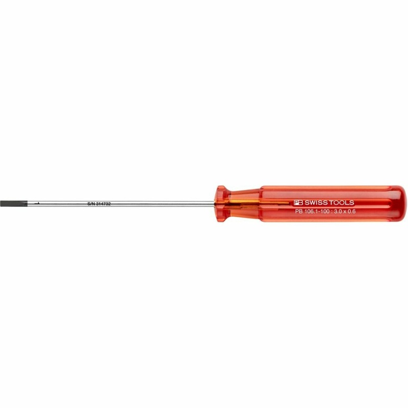 General InformationBrandPB Swiss ToolsPackagingBulkCountry of OriginSwitzerlandUPC7610733013210California ResidentsProposition 65 WarningPart NumberPB 106.1-100Product TypeStandard ScrewdriverPhysical CharacteristicsLength190 mmWeight0.03 kg0.06 lbFinishSmooth, chromedDiameter3 mmDetailsTip TypeSlottedFeaturesfor slotted screws