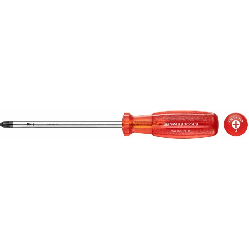 General InformationBrandPB Swiss ToolsUPC7610733028931PackagingBulkCountry of OriginSwitzerlandCalifornia ResidentsProposition 65 WarningPart NumberPB 6190.3-150Product TypeStandard ScrewdriversPhysical CharacteristicsFinishStructured, ChromedLength270 mmDiameter 8 mmWeight0.15 kg0.33 lbDetailsTip TypePhillipsSizePH3Blade Length150 mmFeaturesFor Phillips screws