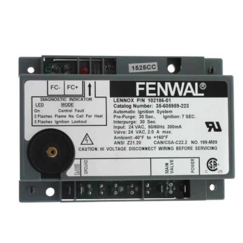 The Fenwal 35-605959-223 is a 24 VAC microprocessor-based ignition control module, designed for direct spark ignition configurations specifically in the G765BCA-12 model. This product by Teledyne Laars facilitates reliable and precise control necessary for efficient system operation.
